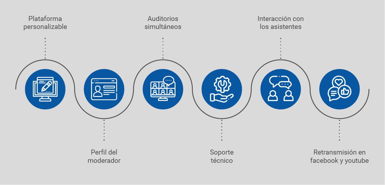 Realiza tus eventos virtuales como congresos, asambleas, conferencias, foros, webinars, charlas y seminarios.