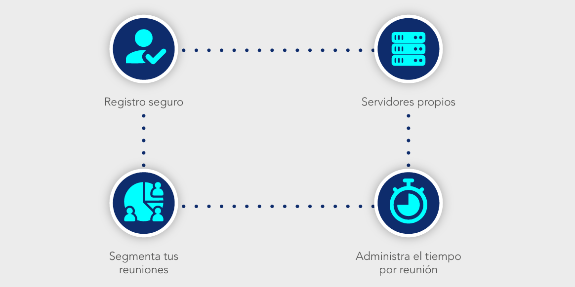 Nuestras salas le permiten a cualquier integrante de tu empresa y aliados ingresar a una reunión desde cualquier dispositivo, además, las personas conectadas pueden compartir chat, cámara, pantalla, grabar las reuniones y levantar la mano.